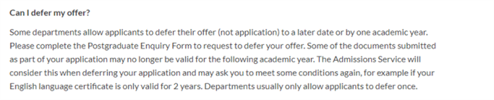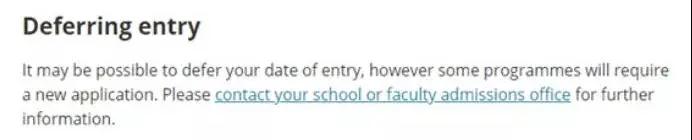 華威大學(xué)的延期是直接提交Postgraduate Enquiry Form等待反饋,例如去年Economic and International Financial Economic專業(yè),但華威商院里面也有專業(yè)不能延期,另外雅思是否會過期也會是延期考量的因素。