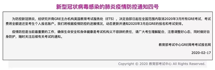 2月17日,ETS在官網(wǎng)上公布,GRE三月在中國大陸地區(qū)的所有考試取消。
