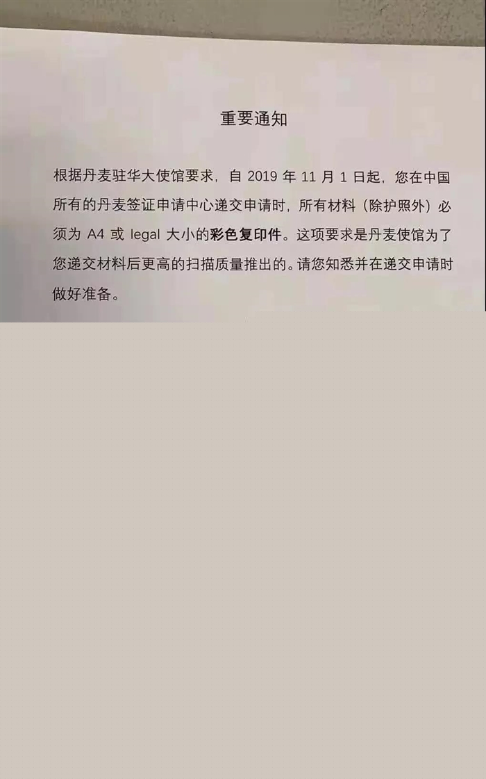 烏魯木齊出國(guó)留學(xué)機(jī)構(gòu)告訴大家2019年11月1日起,申請(qǐng)人在所有丹麥簽證中心遞交申請(qǐng)時(shí),所有材料(除護(hù)照外),必須為A4或legal大小的彩色復(fù)印件。