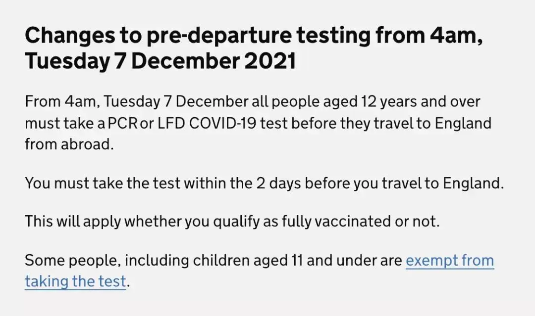 12月5日(周日),英國政府發(fā)布了最新的入境規(guī)則:從12月7日(周二)清晨4:00開始,所有12歲及以上前往英國的乘客必須在起飛前48小時(shí)內(nèi)進(jìn)行新冠核酸檢測或LFD快速檢測,并拿到檢測陰性證明。