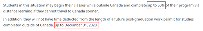 在這種情況下,留學生的PGWP申請不會因為在加拿大境外度過的時間而被扣除,有效期至2020年12月31日。這就意味著,即將在今年秋季學期入學的留學生,可以在9月通過加拿大指定教育機構學習在線課程,只要在2020年12月31日前返回加拿大,并繼續(xù)完成剩余的為期至少2年的課程,仍然有資格獲得最多3年的畢業(yè)工簽。