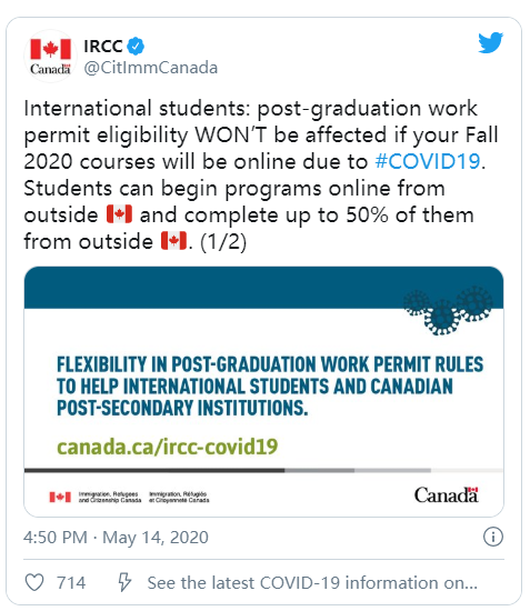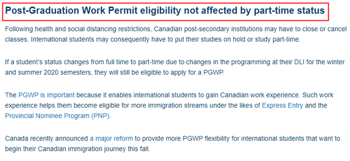 基于加拿大移民局原有的政策,一般網(wǎng)課是不計入PGWP的,但是由于疫情對留學生產生了重大的影響,外加受到健康和旅行的限制,很多留學生無法順利返校,因此,加拿大移民部允許留學生在2020年秋季學年留在海外完成50%的線上課程,并在之后返回加拿大完成整個課程后,仍有資格獲取得畢業(yè)工簽。
