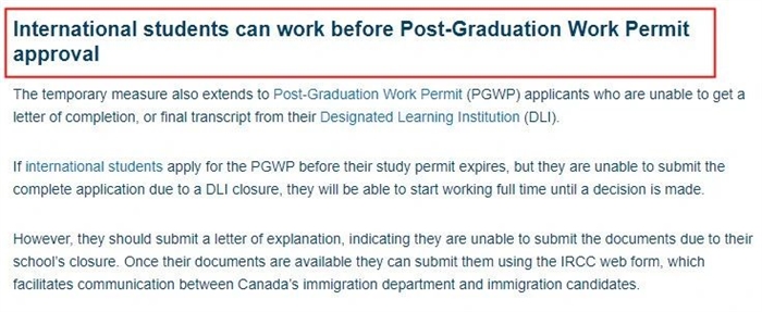 同時,該項臨時措施還適用于無法獲得結業(yè)證明的畢業(yè)工簽(PGWP)申請人。根據(jù)加拿大移民部的政策,畢業(yè)工簽必須在學校開具結業(yè)證明文件后的180天內遞交申請。鑒于疫情期間,眾多指定學習機構(DLI)停課可能導致留學生無法獲取最終成績單或畢業(yè)證書等材料,加拿大移民部允許留學生在申請獲批之前開始全職工作。