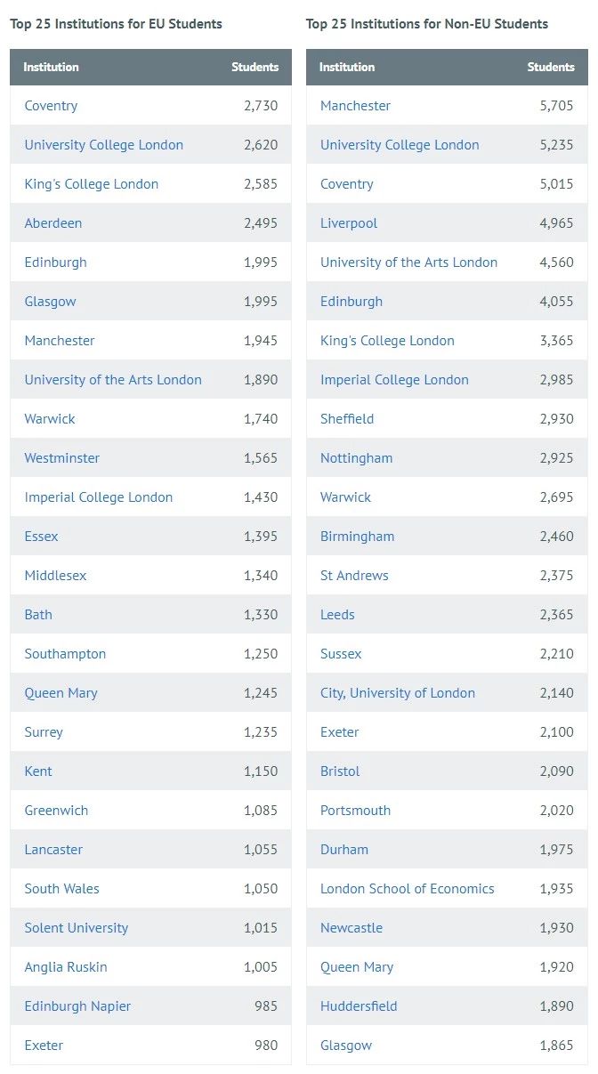 從人數(shù)上來(lái)說(shuō),最多留學(xué)生選擇的英國(guó)院校,非曼大莫屬,排名第二的是UCL,第三名,則是考文垂大學(xué),第四和第五名分別為利物浦大學(xué)和倫敦藝術(shù)大學(xué)。其中前4所大學(xué),為全英排名TOP30以內(nèi)的綜合性頂尖名校。
